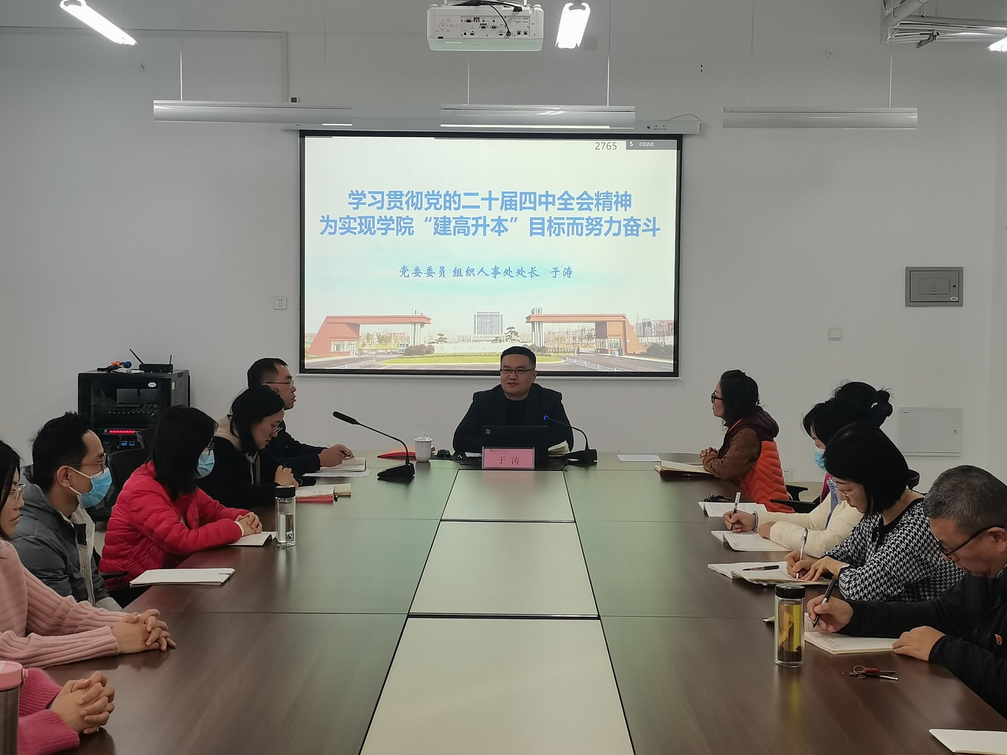 为深入学习贯彻党的二十届四中全会精神,将理论学习成果转化为推动学院“建高升本”的强大动力,12月18日,学院党委委员、组织人事处处长于涛莅临国际商务学院,为党员师生作题为“学习贯彻党的二十届四中全会精神,为实现学院‘建高升本’目标而努力奋斗”的专题党课宣讲。